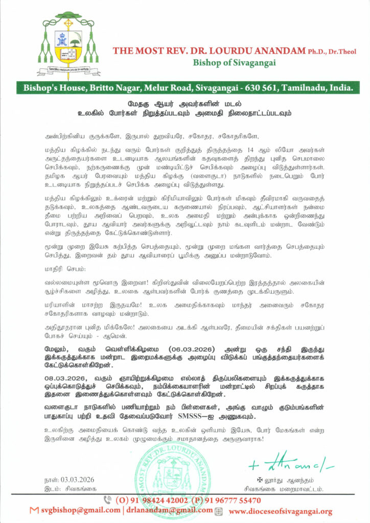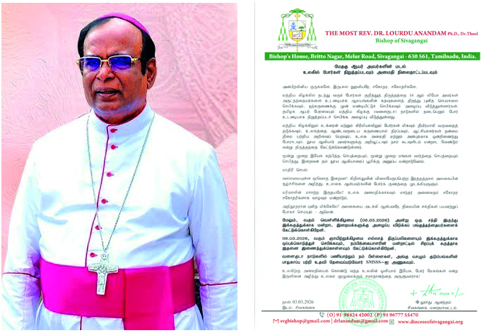 இந்நிலையில் சிவகங்கை மறைமாவட்ட ஆயர் மேதகு லூர்து ஆனந்தம் அவர்கள் மார்ச் மாதம் 6 ஆம் தேதி வெள்ளிக்கிழமை தம் மறைமாவட்ட அருள்பணியாளர்களும் துறவியரும் இறைமக்களும் ஒரு சந்தி இருந்து (ஒருவேளை உணவு தவிர்த்து) திருத்தந்தையின் கருத்துகளுக்காகச் செபிக்கும்படி அழைப்பு விடுத்துள்ளார். மேலும் வரும் ஞாயிற்றுக்கிழமை தம் மறைமாவட்டத்திற்குட்பட்ட ஆலயங்களில் நடைபெறும் அனைத்து திருப்பலிகளையும் திருத்தந்தையின் போர் நிறுத்த கருத்திற்காகவும் உலக அமைதிக்காகவும் செபிக்கவும் விசுவாசிகள் மன்றாட்டுச் செபத்தில் சிறப்புக் கருத்தாக இதனை இணைத்துக் கொள்ளவும் சிவகங்கை மறைமாவட்ட ஆயர் வேண்டுகோள் விடுத்துள்ளார். மேலும் ஒரு மாதிரி செபம் ஒன்றையும் அவர் தம் மடலில் இணைத்துள்ளார்.